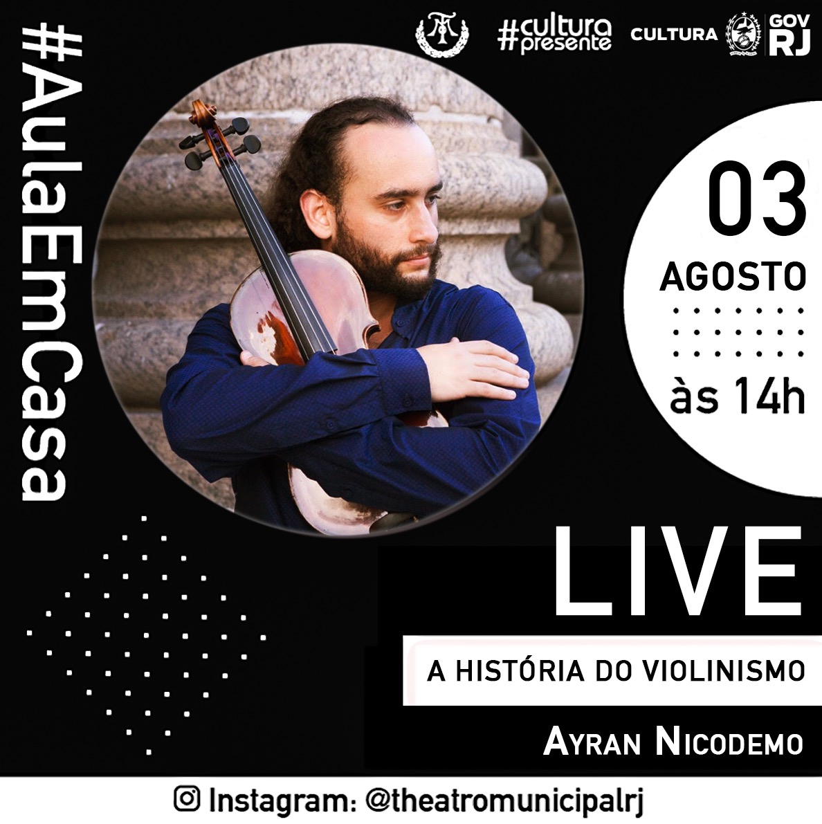 Vem conosco!”. Estas são as palavras do violinista Ayran Nicodemo, da Orquestra Sinfônica do Theatro Municipal do Rio de Janeiro. Na próxima segunda, às 14h, com o patrocínio Ouro Vale e Petrobras, o músico vai ministrar uma aula sobre a história do violinismo, dentro da Campanha #AulaEmCasa, no Instagram do Theatro Municipal do Rio de Janeiro (@theatromunicipalrj). Entre os tópicos, o conceito de violinismo, uma breve história da música, os grandes violinistas ao longo do tempo, a performance e o Ensino do violino.