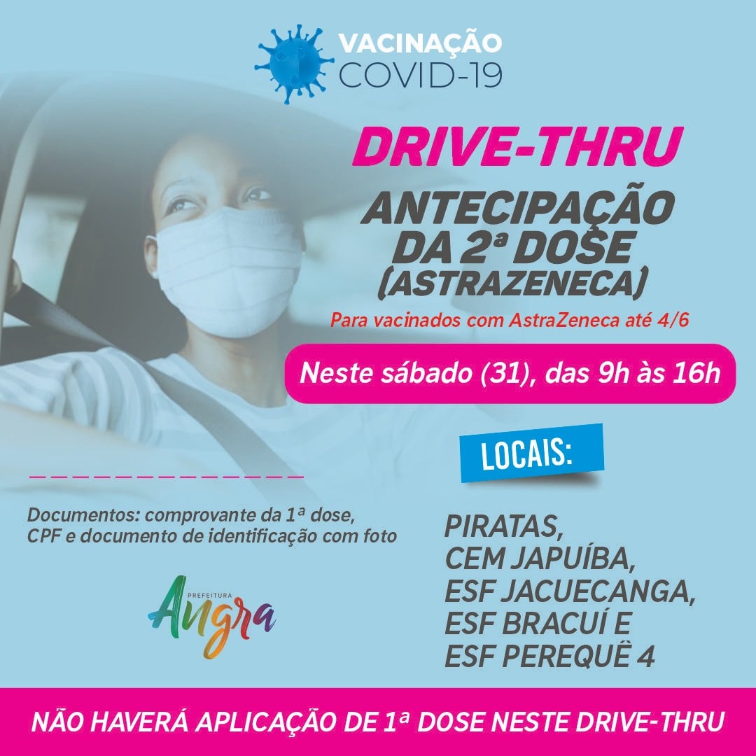 ATENÇÃO: se você tomou a AstraZeneca até o dia 4 de junho em Angra, esta é a sua vez de receber a segunda dose e completar a sua imunização. Cerca de cem profissionais da Saúde estarão te esperando em cinco pontos de vacinação espalhados pelo nosso município.