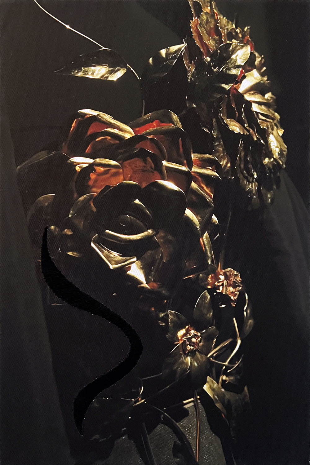 Já em Four Elements, de 2018, são as fotos com folhas de ouro que invocam um olhar multidisciplinar da artista, misturando elementos da fotografia com suportes plásticos, nos apresentando as possibilidades de experimentação possíveis para criar seus trabalhos. Na série Fênix, a artista retoma seu interesse pelo fogo enquanto elemento de transformação, explorando suas possibilidades de reação e expansão. Ao fotografar o resultado da ação do fogo no papel, Fernanda nos coloca diante da perspectiva da ausência de controle, uma vez que, apesar do gesto da artista, é o próprio fogo que irá determinar o resultado final dos desenhos no papel. A partir do registro dessas imagens a artista cria composições que transformam as ações do fogo em um jogo de linhas e sobreposições, mostrando-nos que, apesar de não controlarmos as ações da natureza, é possível um novo olhar sobre elas.
