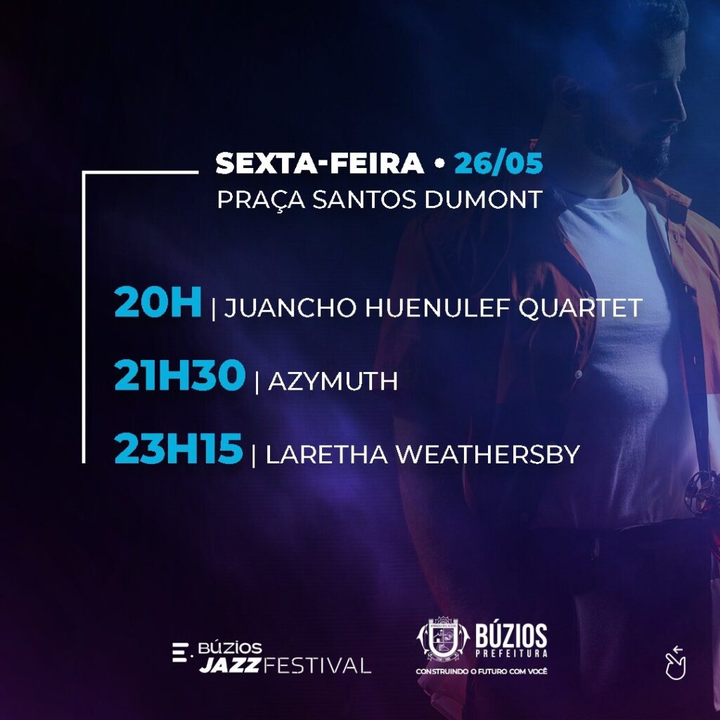 O Búzios Jazz Festival reunirá atrações nacionais e internacionais consagradas como: Laretha Weathersby, Stanley Jordan Trio, Azymuth, Dudu Lima e Márcio Ciribelli Quarteto, Back2Blues, além de Jamz – Tributo a Dolores Duran, entre outros.