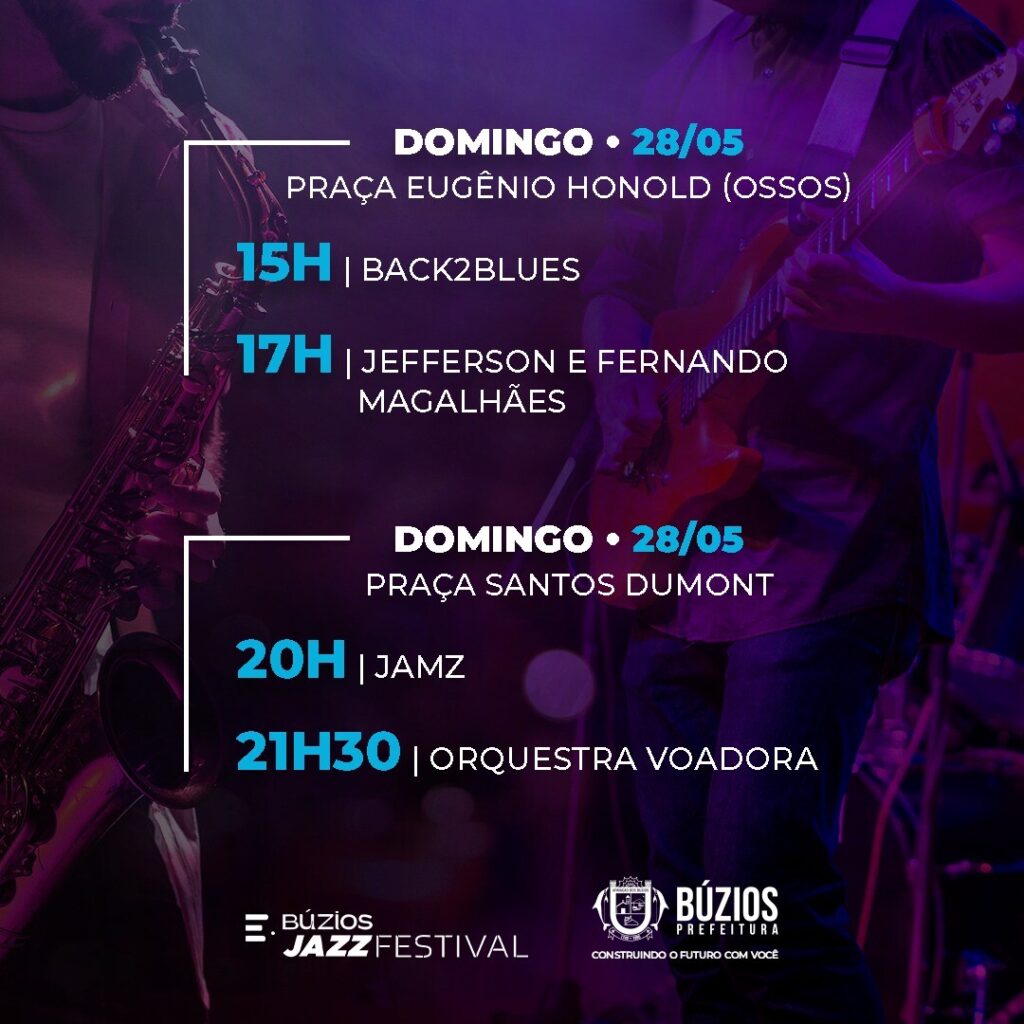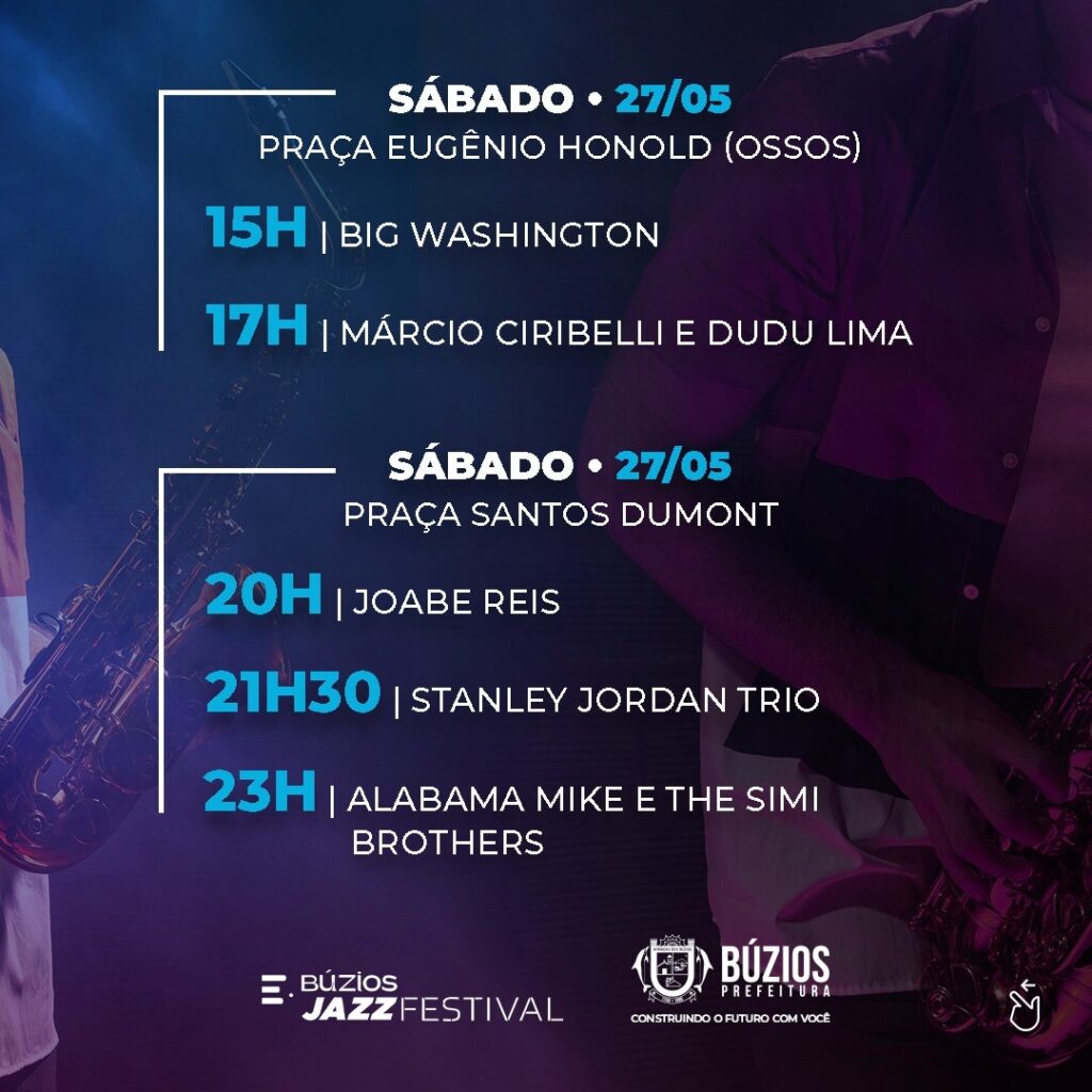 Após o sucesso do primeiro Festival Rock Búzios, vem aí oBúzios Jazz Festival. Os shows serão realizados neste fim de semana (26, 27 e 28/05) nas praças Santos Dumont e Eugênio Honold (Praia dos Ossos). O circuito fortalece o balneário como referência para o turismo nacional e internacional.