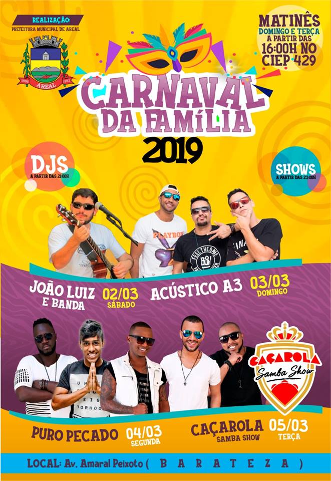 NOTÍCIASCarnaval Carnaval 2019 – Programação de Areal 27 de fevereiro de 2019 0 2530 Compartilhar Facebook Twitter WhatsApp Telegram