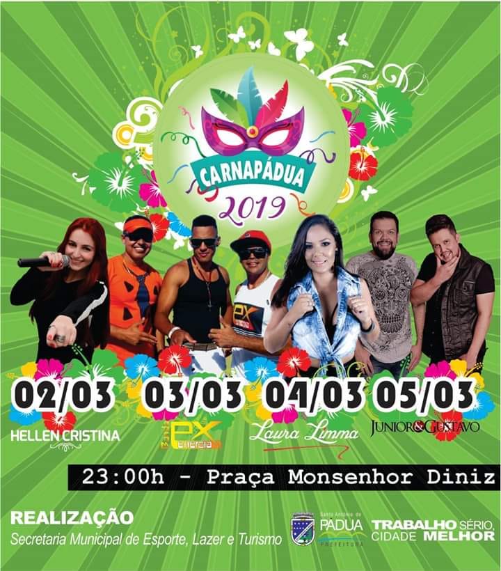 NOTÍCIASCarnaval Carnaval 2019 – Programação oficial de Santo Antonio de Pádua 27 de fevereiro de 2019 0 2721 Compartilhar Facebook Twitter WhatsApp Telegram