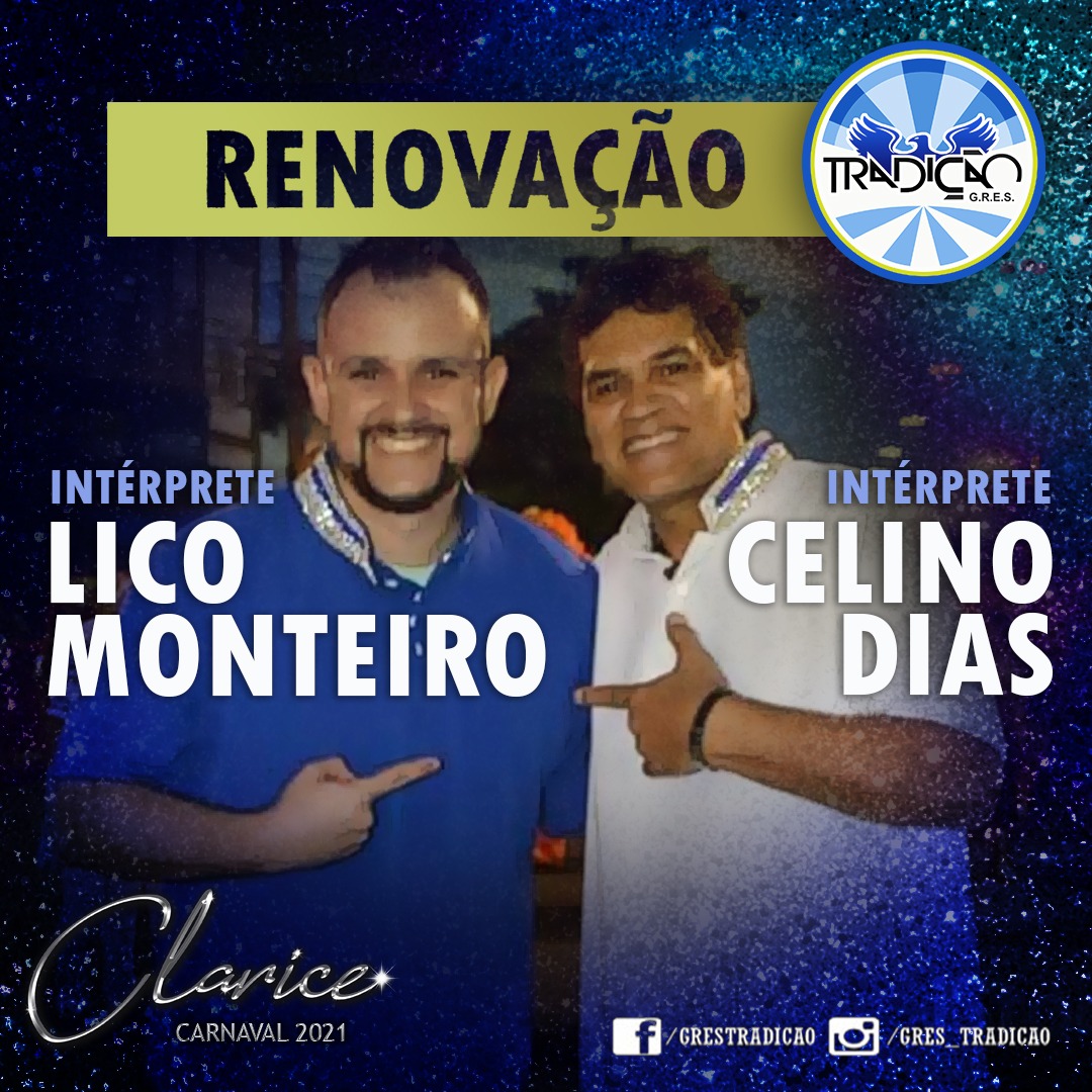 A Escola de Samba Tradição iniciou seus trabalhos rumo ao Carnaval 2021 e acaba de renovar com os intérpretes oficiais Celino Dias e Lico Monteiro. A dupla, que já teve passagem pela Escola em diversos carnavais, esteve à frente do carro de som no desfile deste ano, onde a azul e branco conquistou o título da Série B, da liga Livres, e carimbou seu retorno à Marquês de Sapucaí. Feliz em poder contar com os intérpretes, a presidente Raphaela Nascimento adiantou que mais novidades estão por vir para consolidar a chegada da Tradição à Série A do Carnaval carioca.