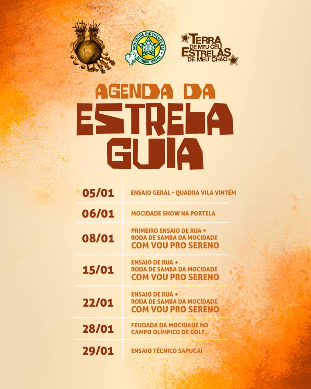 A agremiação será a terceira a desfilar na Sapucaí, pelo Grupo Especial da LIESA, no domingo de carnaval (19/02), apresentando o enredo “TERRA DE MEU CÉU, ESTRELAS DE MEU CHÃO”, de autoria e desenvolvimento do carnavalesco Marcus Ferreira.