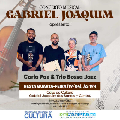 A Casa da Cultura de São Pedro da Aldeia recebe, nesta quarta-feira (19/04), às 19h, a segunda apresentação da temporada 2023 do Concerto Musical Gabriel Joaquim, promovido pela Secretaria Municipal de Cultura. O evento terá como atração principal a banda Carla Paz & Trio Bossa Jazz, que apresentará um repertório de clássicos da bossa nova e do jazz nacional. A entrada é gratuita, sujeita à lotação do espaço (60 lugares).