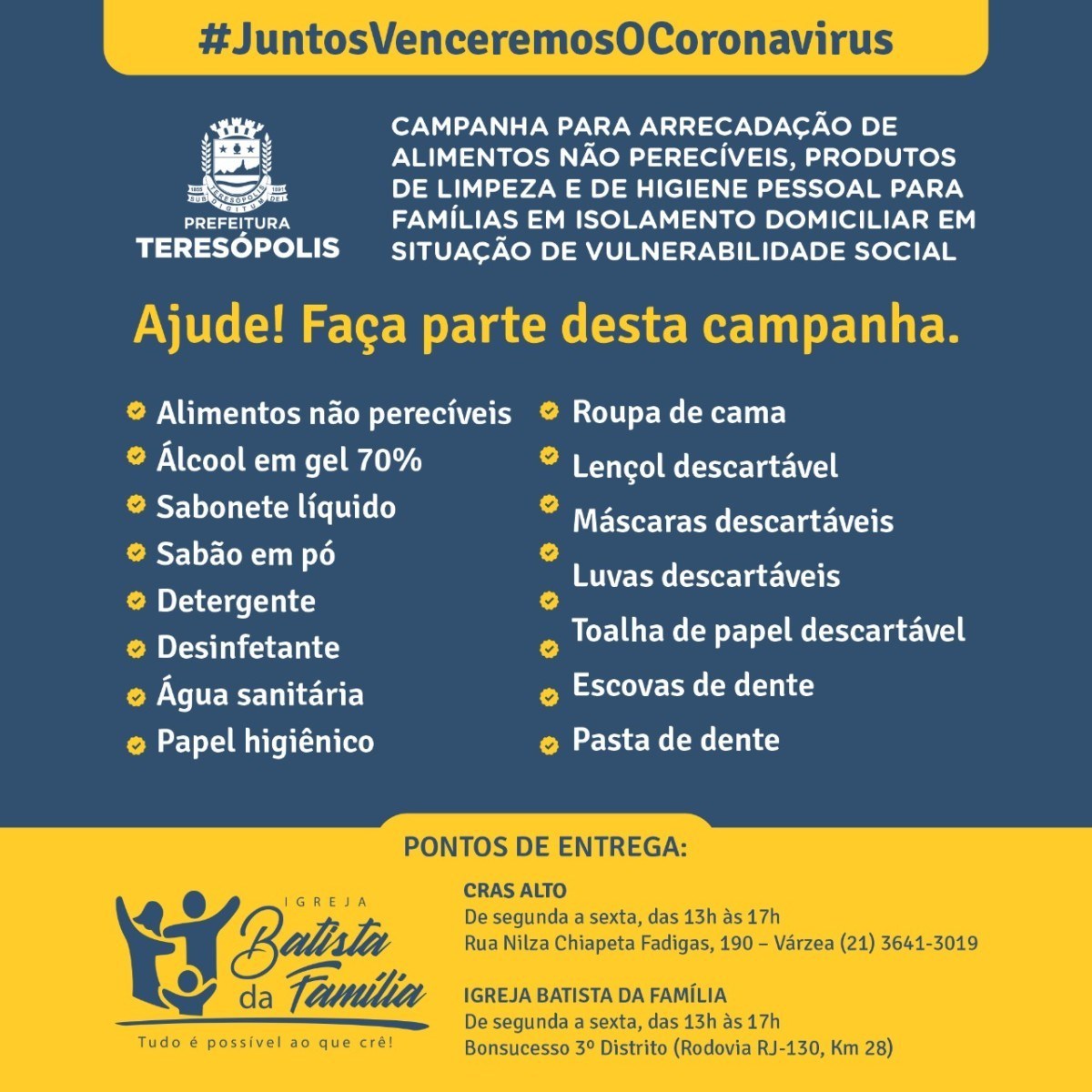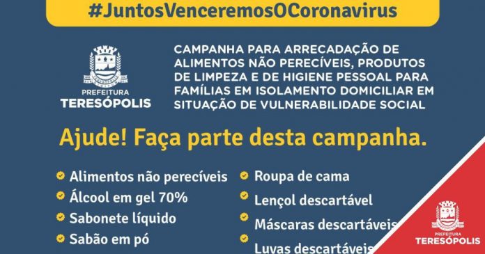 A Prefeitura de Teresópolis, por meio da Secretaria de Desenvolvimento Social, está promovendo uma campanha para arrecadar alimentos não perecíveis, produtos de limpeza e de higiene pessoal que serão doados para famílias em isolamento domiciliar por suspeita de contaminação pelo Coronavírus e que se encontram em situação de vulnerabilidade social. Ajude! Faça Parte desta campanha.