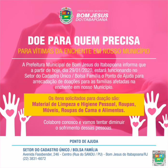 NOTÍCIAS Doação para as vítimas das enchentes de Bom Jesus de Itabapoana 30 de janeiro de 2020 0 2688 Compartilhar Facebook Twitter WhatsApp Telegram