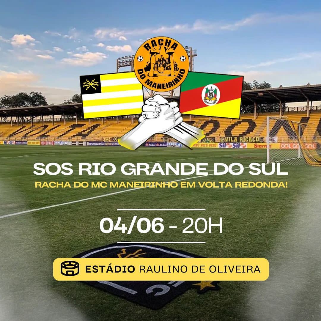 Personalidades da música e influencers digitais irão marcar presença em Volta Redonda na próxima terça-feira, dia 04, às 20h, no Estádio da Cidadania, para a realização do “Racha do MC Maneirinho”, jogo de futebol amistoso beneficente que terá arrecadação de donativos para as vítimas das enchentes no Rio Grande do Sul.