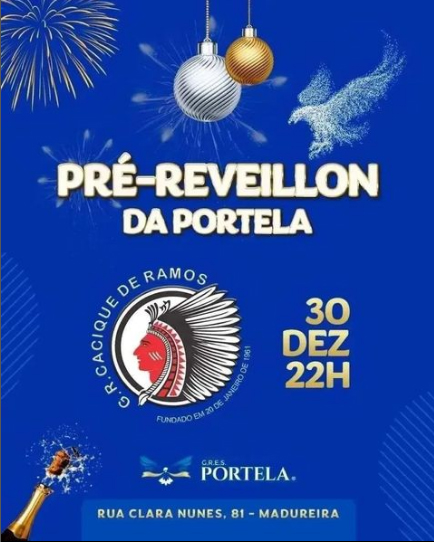 Ingressos à venda pelo link https://www.ingresse.com/pre-reveillon-da-portela (link na bio) ou na bilheteria da agremiação, de segunda a sexta, das 10h às 18h. Informações na secretaria da escola: (21) 2137-7831. A festa começa às 22h, na quadra da escola (Rua Clara Nunes, 81 – Madureira).