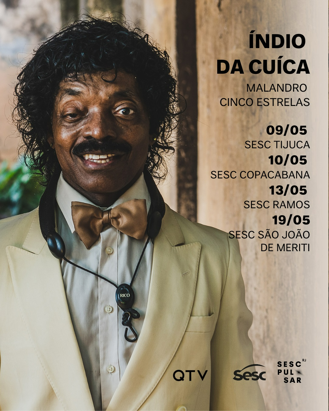 No dia 09/05, ele estreia o show no Sesc Tijuca e no dia seguinte, sobe ao palco do teatro do Sesc Copacabana. No dia 13/05, sábado, o baile será no subúrbio com destaque no Sesc Ramos. Na semana seguinte, no dia 19/05, Índio da Cuíca leva seu espetáculo para o Sesc São João de Meriti.