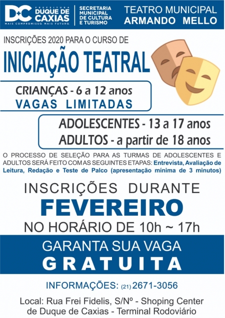 A partir do dia 03/02, a Secretaria Municipal de Cultura e Turismo de Duque de Caxias dará início às inscrições para o Curso de Iniciação Teatral, realizado no Teatro Municipal Armando Mello, localizado na Av. Frei Fidélis, s/nº – Shopping Center de Duque de Caxias (Em frente ao ponto do Méier x Caxias).