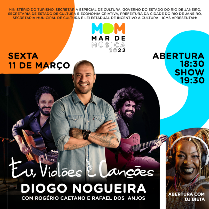 O “MAR de Música” está de volta e inicia já com dois shows no mês de Março. A retomada do projeto será na próxima sexta-feira (11/03) com o show especial do cantor Diogo Nogueira “Eu, Violões e Canções”. Diogo vem acompanhado dos músicos Rogério Caetano (violão de 7 cordas) e Rafael dos Anjos (violão de 6 cordas), numa combinação única, cantando algumas das mais emblemáticas músicas do cancioneiro popular brasileiro.