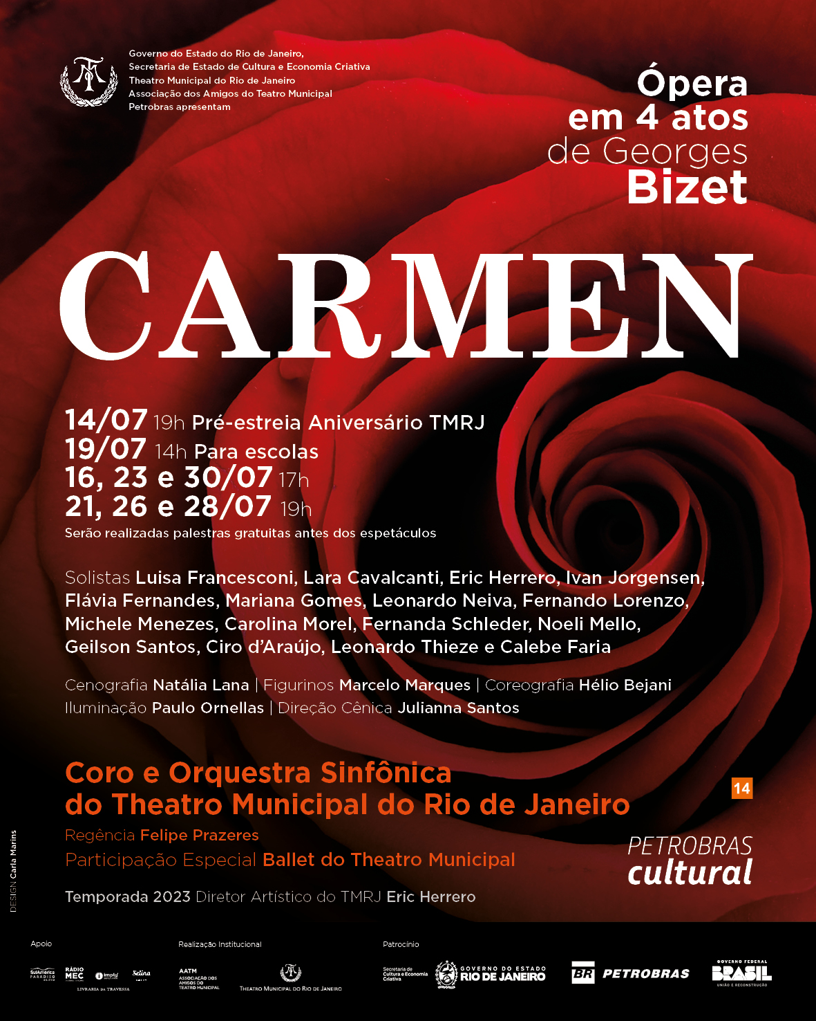 No aniversário de 114 anos, o Theatro Municipal do Rio de Janeiro, com o patrocínio Ouro Petrobras e realização AATM, abre as portas para o público com intensa programação gratuita e faz a pré-estreia de uma das obras mais populares do repertório operístico: Carmen, de Bizet. Com direção musical e regência do maestro titular do TMRJ, Felipe Prazeres, e concepção e direção cênica de Julianna Santos, a ópera contará com a participação do Coro, Ballet e Orquestra Sinfônica do Theatro, além dos solistas Luisa Francesconi e Lara Cavalcanti (Carmen), Eric Herrero e Ivan Jorgensen (Don José), Flavia Fernandes e Mariana Gomes (Micaela), Leonardo Neiva e Fernando Lorenzo (Escamillo), Michele Menezes e Carolina Morel (Frasquita), Fernanda Schleder e Noeli Mello (Mercedes), Geilson Santos (Remendado), Ciro d’Araújo (Dancaire), Leonardo Thieze (Zuniga) e Calebe Faria (Morales).