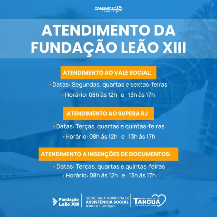 NOTÍCIASUtilidade Pública Tanguá – Dias e horários de funcionamento da Fundação Leão XIII 19 de julho de 2021 0 2188 Compartilhar Facebook Twitter WhatsApp Telegram Fiquem atentos aos horários e dias de funcionamento da Fundação Leão XIII. O órgão fica localizado na Rua Ataíde Salatiel de Velasco, 63 – Centro, Tanguá.
